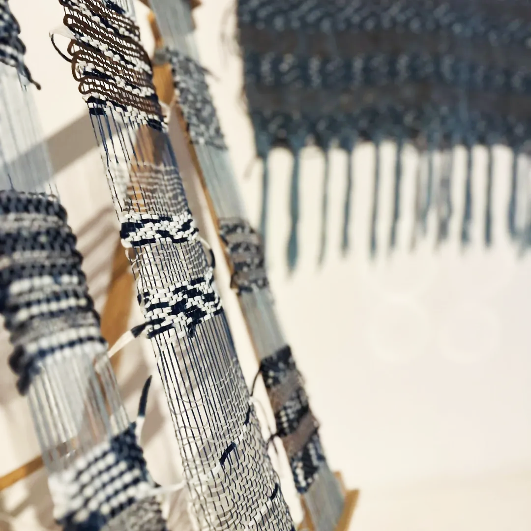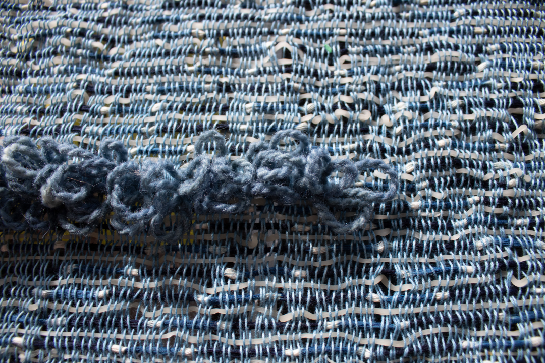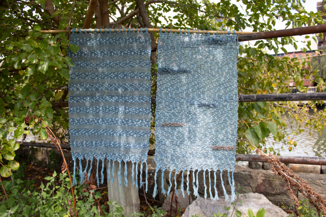 ‘Ode to Hirokawa: A Threshold Between Worlds’  lives at the edge of ancient craft and biotechnology—rooted in place, lineage, and a desire to collaborate with living systems. Amy Chien started this journey by reviving an inherited strain of E. coli, genetically modified to produce indigo, and used that pigment to dye wool yarn. While in Hirokawa – a town known for preserving traditional Japanese indigo dyeing and kurume kasuri weaving – she dyed waste cotton yarn in sukumo indigo vats, and extruded algae bioyarn dyed with yame matcha and black sesame—local pigments embedded in Yame heritage and culture. Each material was chosen with care, with slowness, with respect for rhythm—biological, seasonal, ancestral. The weaving itself draws from the region’s material craft practices using kasuri techniques passed down through generations, and the result is the merging of Japanese indigo-dyed yarn from Aizome Kasuri Kobo, biobased indigo, and algae bioyarn that is weaved into this unique collection.