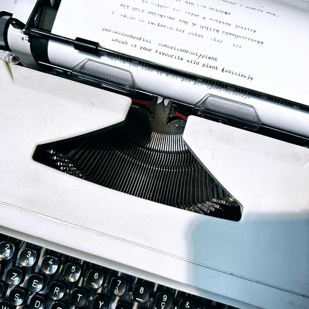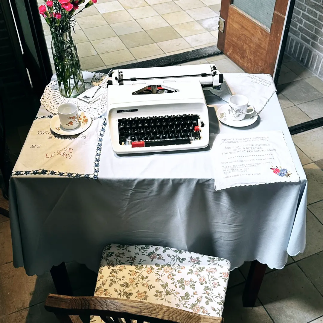 Jade LE RAY’s installation invites spontaneous human connection. It gently disrupts the daily rhythm—poetically and playfully—through almost-forgotten forms of communication. A shared sheet of paper in a typewriter, two chairs facing each other, waiting for a conversation to begin. It’s about creating moments where people feel welcome to share—a quiet reminder that we are all living together.