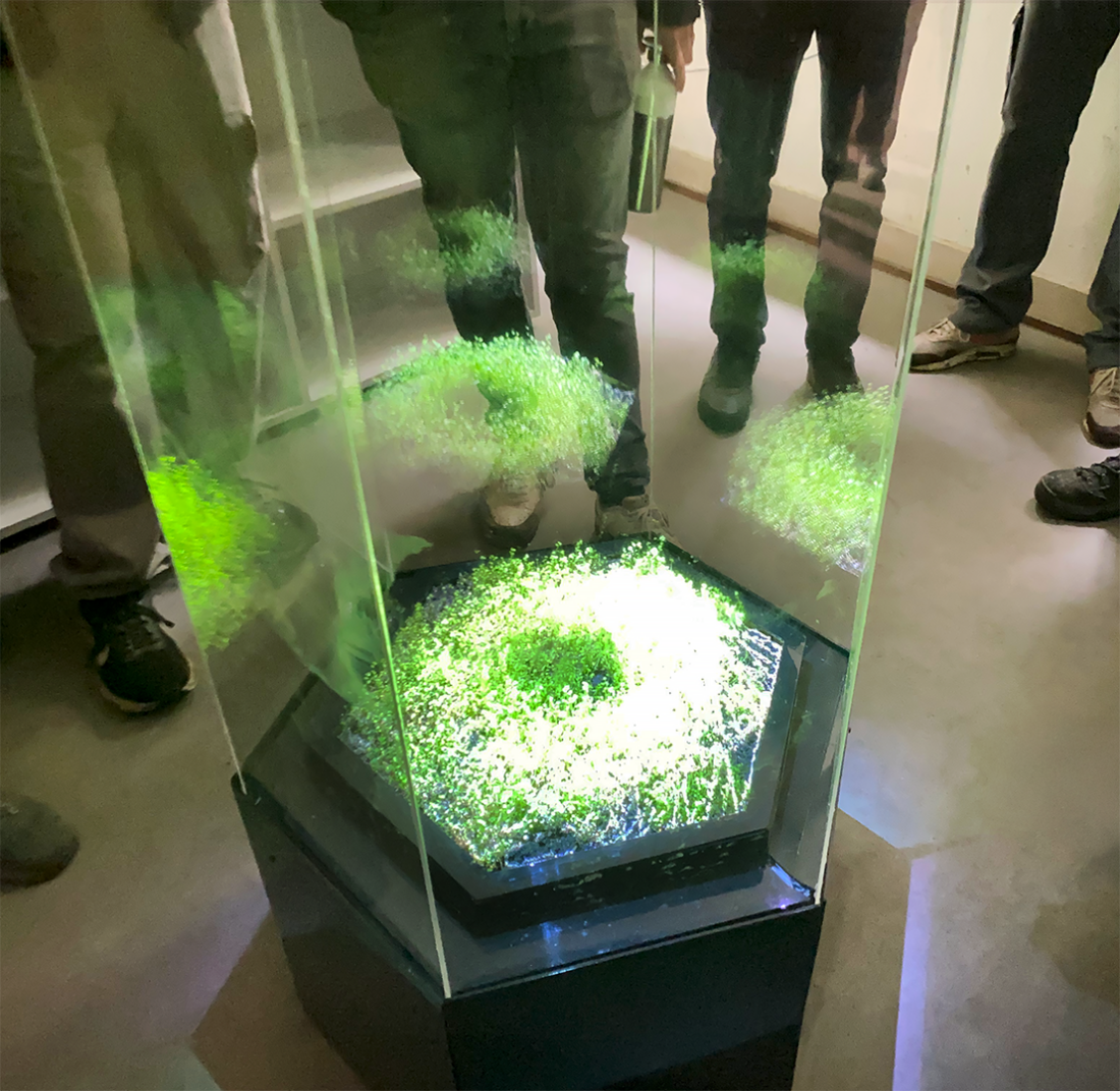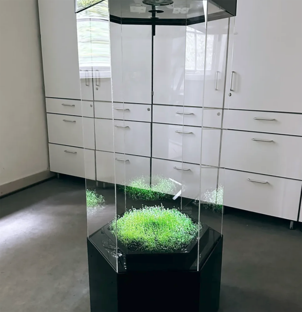 The installation traces a quiet dialogue between a living organism and an electronic presence. Enclosed within a specially designed vessel, a plant’s breath—its photosynthesis—is sensed through carbon dioxide sensors, translated into shifting fields of light patterns that return to the plant. In this looping exchange, growth is gently stimulated. Plant and system respond to one another, co-evolving in a shared rhythm that reveals the ongoing conversation between biology and technology. The state of mutual coexistence between an electronic system and a plant species speaks conceptually and physically of circularity and connects with concepts such as the “between” coined by Donna Haraway, practices of reusing environmental resources, or policies focused on social systems in harmony with nature.
