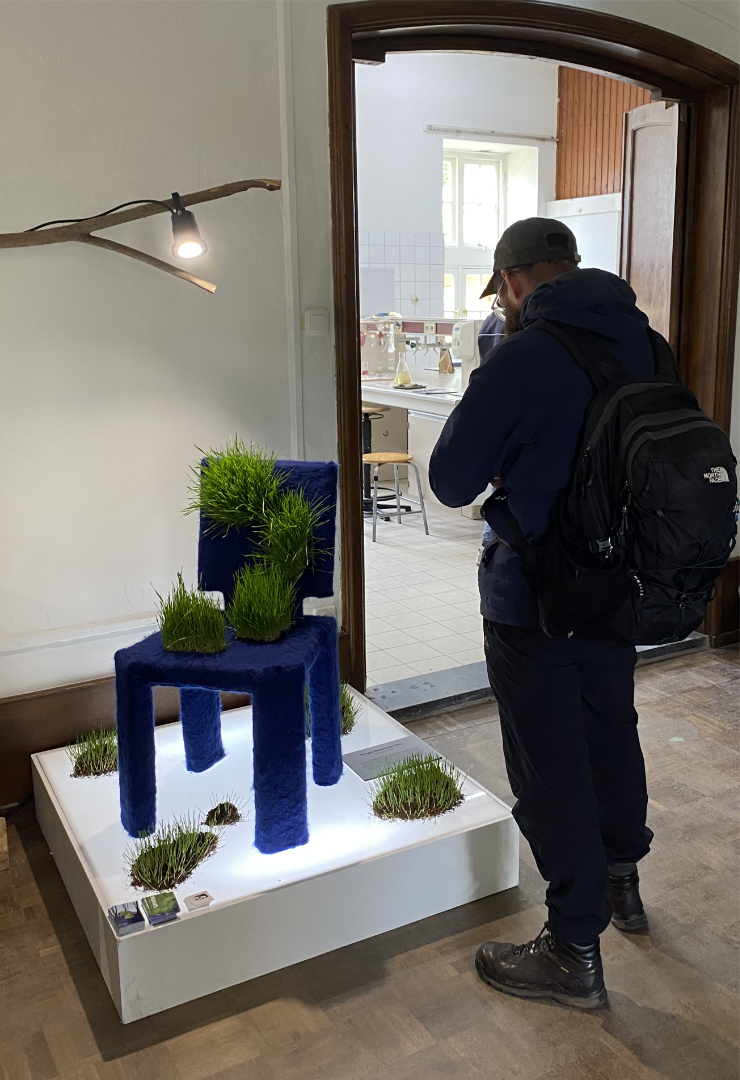 ‘Natureculture hacking’ investigates both practical and philosophical aspects of hacking, resulting in five design principles applied to studio GROOVIDO’s Arcade Chair. Grass is planted in the iconic Pac-Man maze, gradually growing to reshape it into a unique, lasting pattern. As the grass completes its life cycle, the roots remain, binding the seat and transforming it into a functional chair. Through the see-through panel at the seat’s back, visitors can see the pathways of the roots.